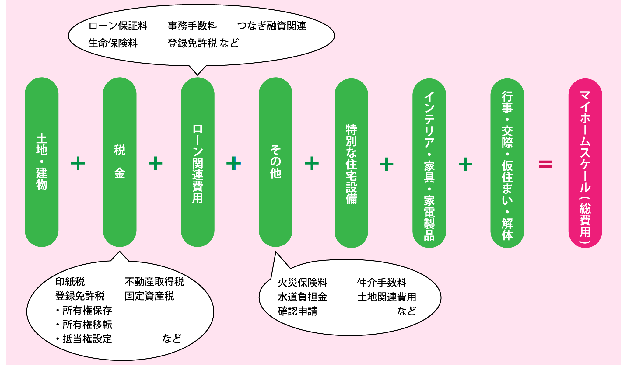 ローン関連費用:ローン保証料、事務手数料、つなぎ融資関連、生命保険料、登録免許税など